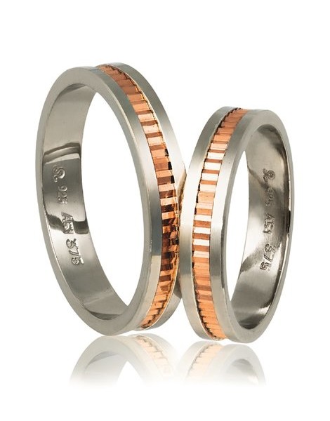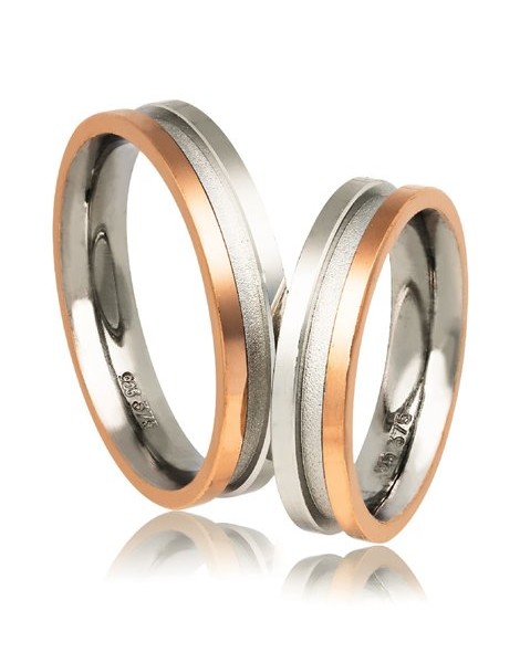 Ζευγάρι βέρες γάμου από Ασήμι 925 και Χρυσό 9Κ σε ροζ.Η βάση τους είναι πλακέ ενώ το ένθετο είναι μπουλ.Η γυναικεία μπορεί να στολιστεί και με πέτρες ημιπολύτιμες (ζιργκόν) ενώ το μέγεθος τους προσαρμόζεται με το νούμερο της αρεσκείας σας.