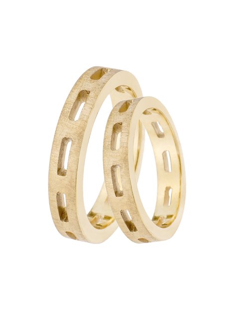 Ζευγάρι βέρες γάμου κατασκευασμένες από κίτρινο Χρυσό 9Κ όπου η επιφάνεια τους είναι πλακέ,ματ και έχει ορθογώνια σχήματα ανάμεσα της. Το μέγεθος μπορεί να προσαρμοστεί με το νούμερο της αρεσκείας σας.