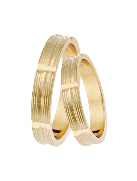 Ζευγάρι βέρες γάμου κατασκευασμένες από κίτρινο Χρυσό 9Κ όπου η επιφάνεια τους είναι πλακέ,γυαλιστερή με κοψίματα ενώ το μέγεθος μπορεί να προσαρμοστεί με το νούμερο της αρεσκείας σας.