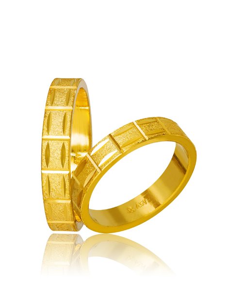 Βέρες γάμου από Χρυσό Κ9 σε κίτρινο χρώμα.Η επιφάνεια τους είναι πλακέ ενώ η επεργασία τους σατινέ.Η γυναικεία μπορεί να στολιστεί με πέτρες ημιπολύτιμες ενώ το μέγεθος τους προσαρμόζεται με το νούμερο της αρεσκείας σας.