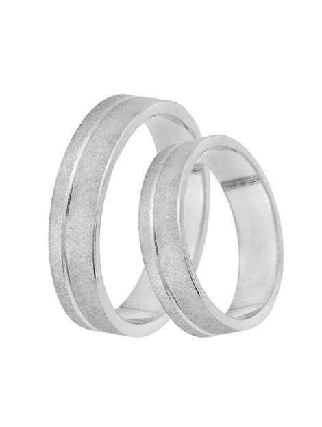 Ζευγάρι βέρες αρραβώνα με πλακέ επιφάνεια και ένα συνδυασμό ματ και γυαλιστερής.Οι βέρες είναι κατασκευασμένες από Λευκόχρυσό 14Κ.Τα νούμερα τους μπορούν να προσαρμοστούν μεγέθη της αρεσκείας σας.