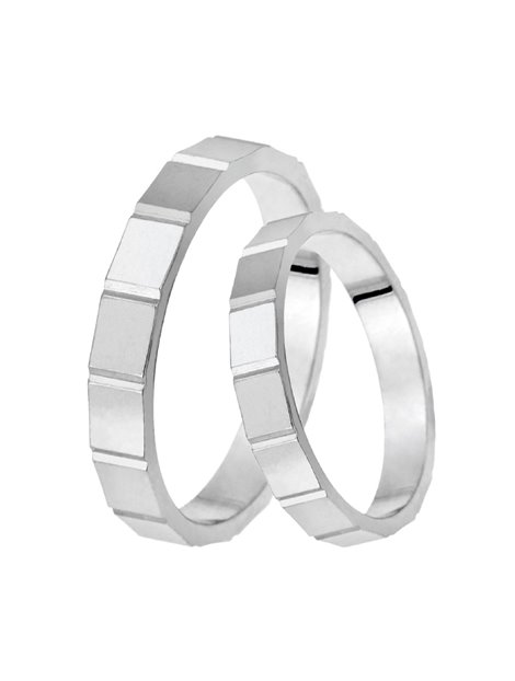 Βέρες γάμου με πλακέ επιφάνεια και κοψίματα ανάμεσα τους, κατασκευασμένες από Λευκόχρυσό 14Κ.Τα νούμερα τους μπορούν να προσαρμοστούν μεγέθη της αρεσκείας σας.