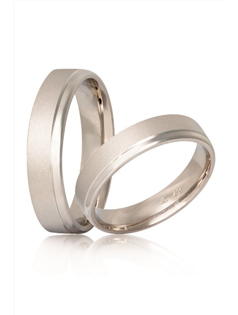Ζευγάρι βέρες γάμου από χρυσό Κ9 σε λευκό χρώμα.Η επιφάνεια τους είναι πλακέ ενώ η επεξεργασία τους σατινέ.Η γυναικεία μπορεί να στολιστεί με πέτρες ημιπολύτιμες ενώ το μέγεθος τους προσαρμόζεται με το νούμερο της αρεσκείας σας.