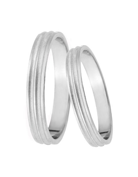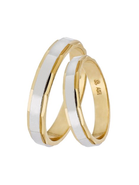 Ζευγάρι βέρες γάμου κατασκευασμένες από λευκόχρυσο 9Κ και κίτρινο Χρυσό όπου η επιφάνεια τους έχει ένα συνδυασμό πλακέ και κοψιμάτων ενώ το μέγεθος μπορεί να προσαρμοστεί με το νούμερο της αρεσκείας σας.