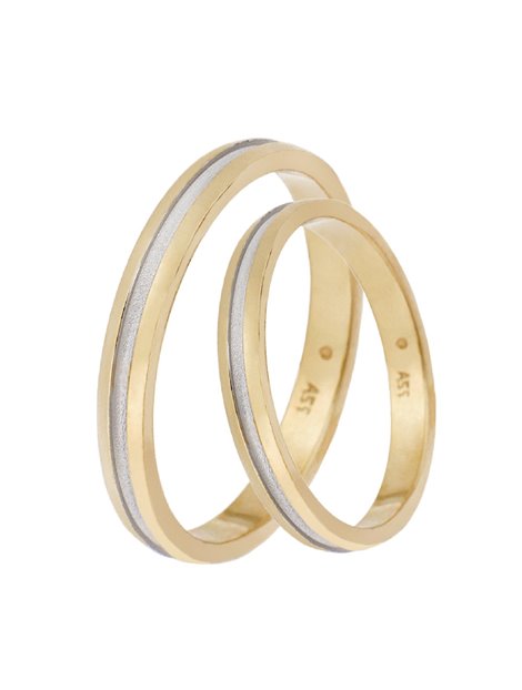 Ζευγάρι βέρες γάμου κατασκευασμένες από κίτρινο Χρυσό και λευκόχρυσο 9Κ όπου η επιφάνεια τους είναι μπουλ και στο κέντρο ματ ενώ το μέγεθος μπορεί να προσαρμοστεί με το νούμερο της αρεσκείας σας.