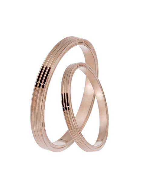 Ζευγάρι βέρες γάμου από ροζ Χρυσό Κ14 με επιφάνεια γυαλιστερή και λαξευμένα σχέδια ανάμεσα τους ενώ το μέγεθος τους προσαρμόζεται με το νούμερο της αρεσκείας σας.