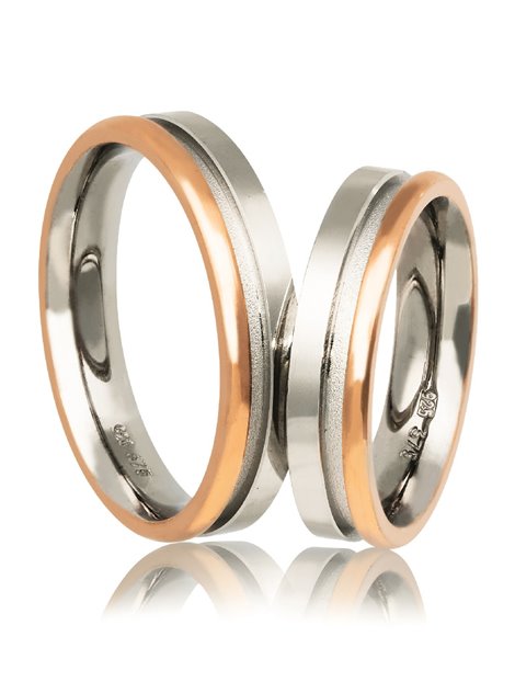 Ζευγάρι βέρες γάμου από ασήμι 925 σε λευκό χρώμα και χρυσό Κ14 σε ροζ . Η βάση τους είναι σατινέ ενώ το ενθετο λουστρέ.Η γυναικεία μπορεί να στολιστεί με πέτρες ημιπολύτιμες ενώ το μέγεθος τους προσαρμόζεται με το νούμερο της αρεσκείας σας.