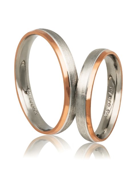 Ζευγάρι βέρες γάμου από ασήμι 925 σε λευκό χρώμα και χρυσό Κ14 σε ροζ . Η βάση τους είναι σατινέ ενώ το ενθετο λουστρέ.Η γυναικεία μπορεί να στολιστεί με πέτρες ημιπολύτιμες ενώ το μέγεθος τους προσαρμόζεται με το νούμερο της αρεσκείας σας.