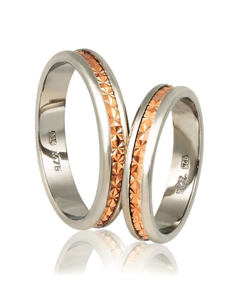 Ζευγάρι βέρες γάμου από ασήμι 925 σε λευκό χρώμα και χρυσό Κ14 σε ροζ . Η βάση τους είναι λουστρέ ενώ το ενθετο σατινέ.Η γυναικεία μπορεί να στολιστεί με πέτρες ημιπολύτιμες ενώ το μέγεθος τους προσαρμόζεται με το νούμερο της αρεσκείας σας.