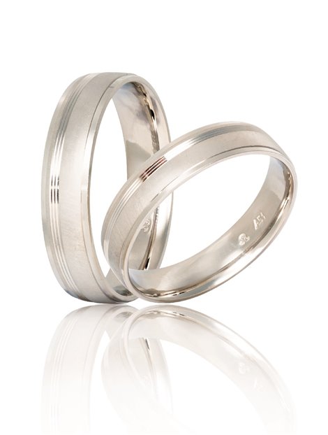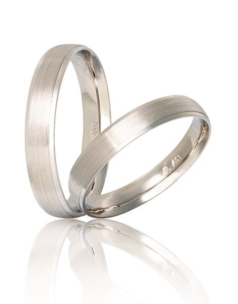 Ζευγάρι βέρες από Χρυσό Κ14 σε λευκό χρώμα.η επιφάνεια τους είναι μπουλ ενώ η επεξεργασία τους σατινέ.Η γυναικεία μπορεί να στολιστεί με πέτρες ημιπολύτιμες ενώ το μέγεθος τους προσαρμόζεται με το νούμερο της αρεσκείας σας.