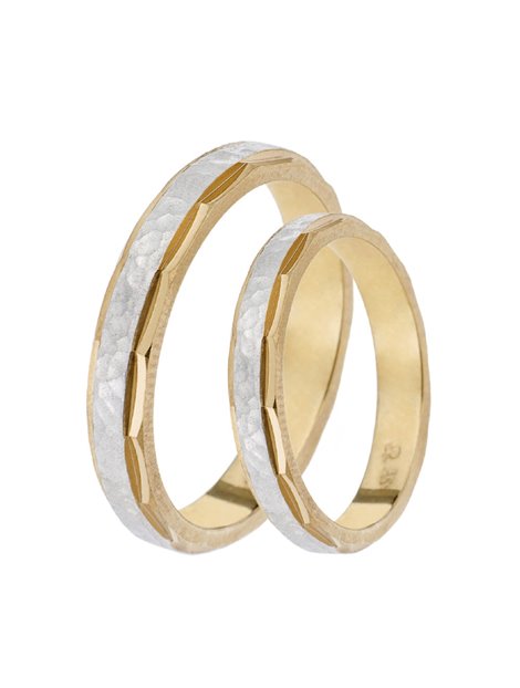 Ζευγάρι Βέρες γάμου με επιφάνεια μισή γυαλιστερή στις άκρες με κοψίματα και στη μέση σφυρηλατημένη.Οι βέρες είναι κατασκευασμένες από Λευκόχρυσό 14Κ και κίτρινο Χρυσό.Τα νούμερα τους μπορούν να προσαρμοστούν μεγέθη της αρεσκείας σας.