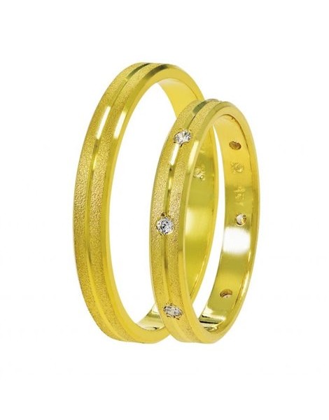Ζευγάρι βέρες γάμου κατασκευασμένες από Χρυσό Κ9 σε κίτρινο χρώμα.Η βάση τους είναι λουστρέ ενώ το ένθετο σατινέ.Η γυνακεία μπορεί να διακοσμηθεί με ημιπολύτιμες πέτρες (ζιργκόν) ενώ το μέγεθος προσαρμόζεται με το νούμερο της αρεσκεία σας.