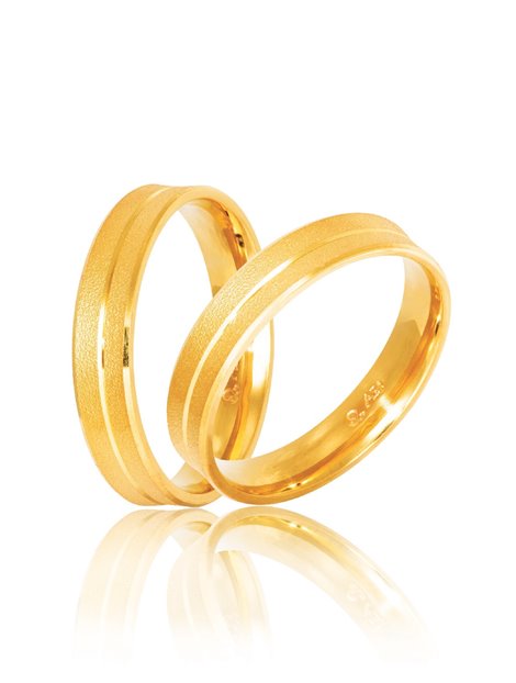 Ζευγάρι βέρες γάμου από Χρυσό Κ9 σε κίτρινο χρώμα.Η επιφάνεια τους είναι πλακέ ενώ η επεξεργασία τους σατινέ.Η γυναικεία μπορεί να στολιστεί με πέτρες ημιπολύτιμες ενώ το μέγεθος τους προσαρμόζεται με το νούμερο της αρεσκείας σας.
