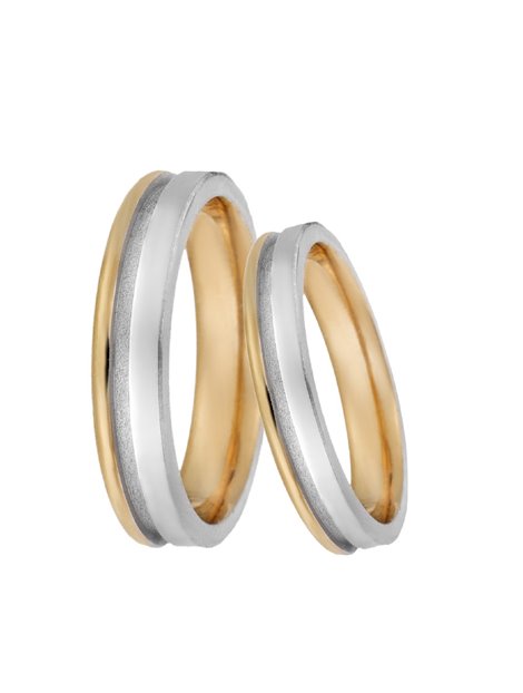 Ζευγάρι βέρες γάμου κατασκευασμένεςαπό κίτρινο Χρυσό και λευκόχρυσο όπου η επιφάνεια τους είναι πλακέ και γυαλιστερή. Το μέγεθος μπορεί να προσαρμοστεί με το νούμερο της αρεσκείας σας.