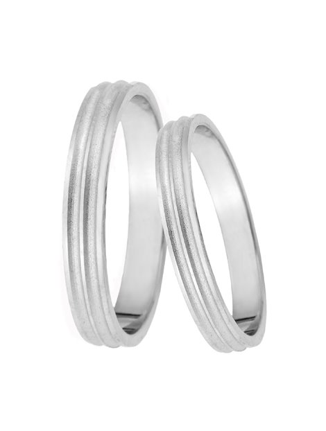 Ζευγάρι βέρες γάμου κατασκευασμένες από λευκόχρυσο 9Κ όπου η επιφάνεια τους είναι πλακέ,γυαλιστερή και ματ με κοψίματα ενώ το μέγεθος μπορεί να προσαρμοστεί με το νούμερο της αρεσκείας σας.