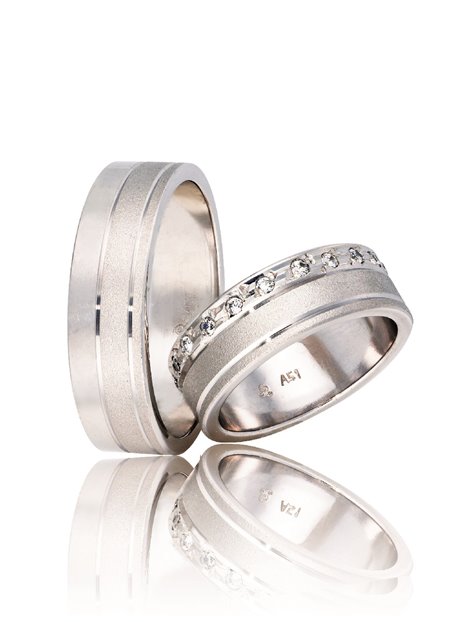 Ζευγάρι βέρες γάμου από Χρυσό 9Κ σε λευκό χρώμα.Η γυναικεία είναι διακοσμημένη με πολύτιμες πέτρες (μπριγιάν).Το μέγεθος τους προσαρμόζεται με το νούμερο της αρεσκείας σας.