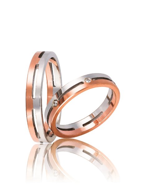 Ζευγάρι βέρες γάμου από Χρυσό 9Κ σε ροζ χρώμα και λευκό.Η γυναικεία είναι διακοσμημένη με πολύτιμες πέτρες (μπριγιάν).Το μέγεθος τους προσαρμόζεται με το νούμερο της αρεσκείας σας.